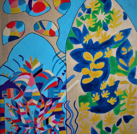 Mes peintures techniques mixtes mais essentiellement acrylique et huile racontent des histoires, des souvenirs de voyages : Le Bel Eté - Vent d'Ouest - Escales bretonnes - Etoiles -Oiseaux exotiques"
